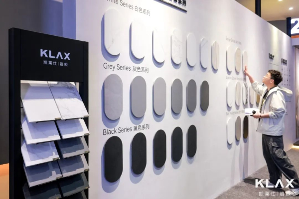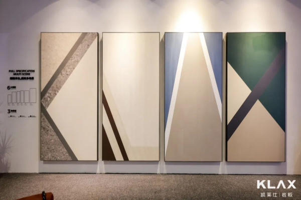 岩板行业工艺前沿的艺术金属系列,也是KLAX此次展出的重头戏之一。冰冷的金属纹理与柔和的雅光质面,刚与柔的碰撞,800*2700mm大规格带来强烈的视觉震撼与丰富的心理体验,充分呈现出高级感。 该系列的独特之处在于,施加了金属釉的岩板表面能呈现出金属质感的光泽,刚毅中存在着柔美,但又有内敛的力量。KLAX采用全球公认最好的西班牙进口陶丽西釉料,打造艺术感十足的特级金属釉,工艺组合、釉面质感、产品图形,均展现了超高艺术水平,宛如艺术家的装置艺术作品,成为展位内最热门的拍照点。 岩之有物 顶流展览,万人共鉴
